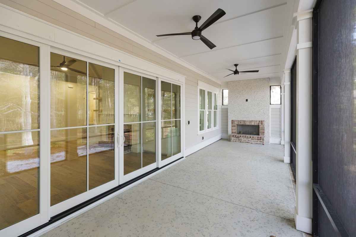 screened porch with fireplace
