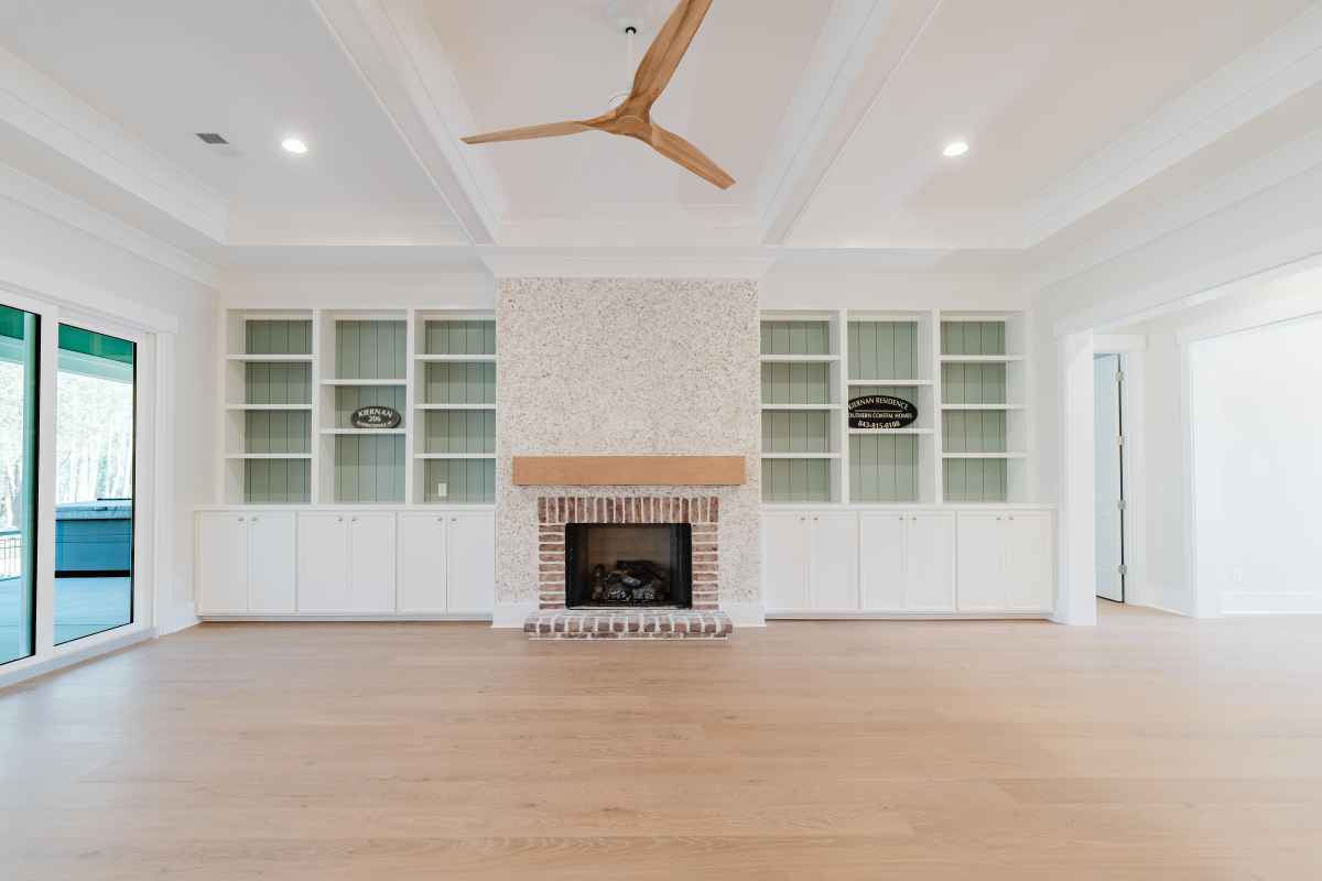 Custom built-in cabinetry with tabby and brick fireplace