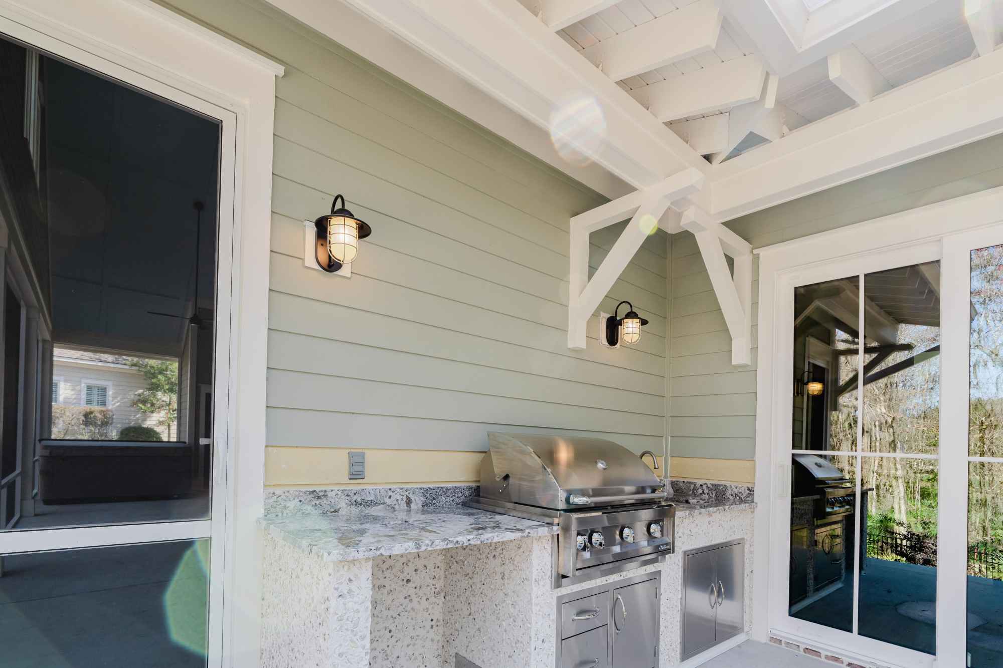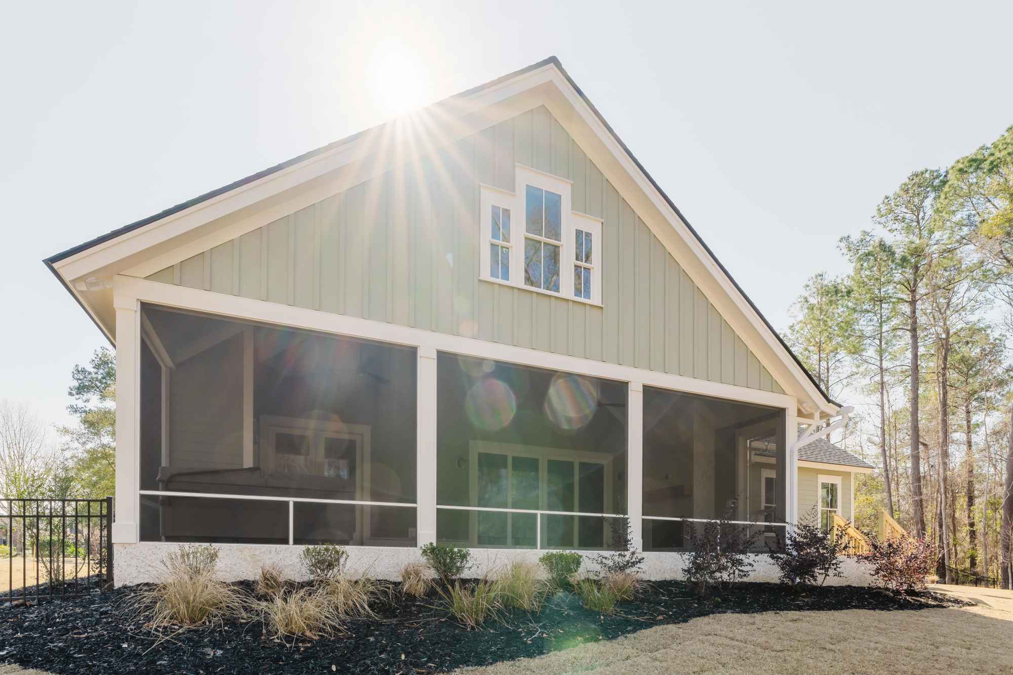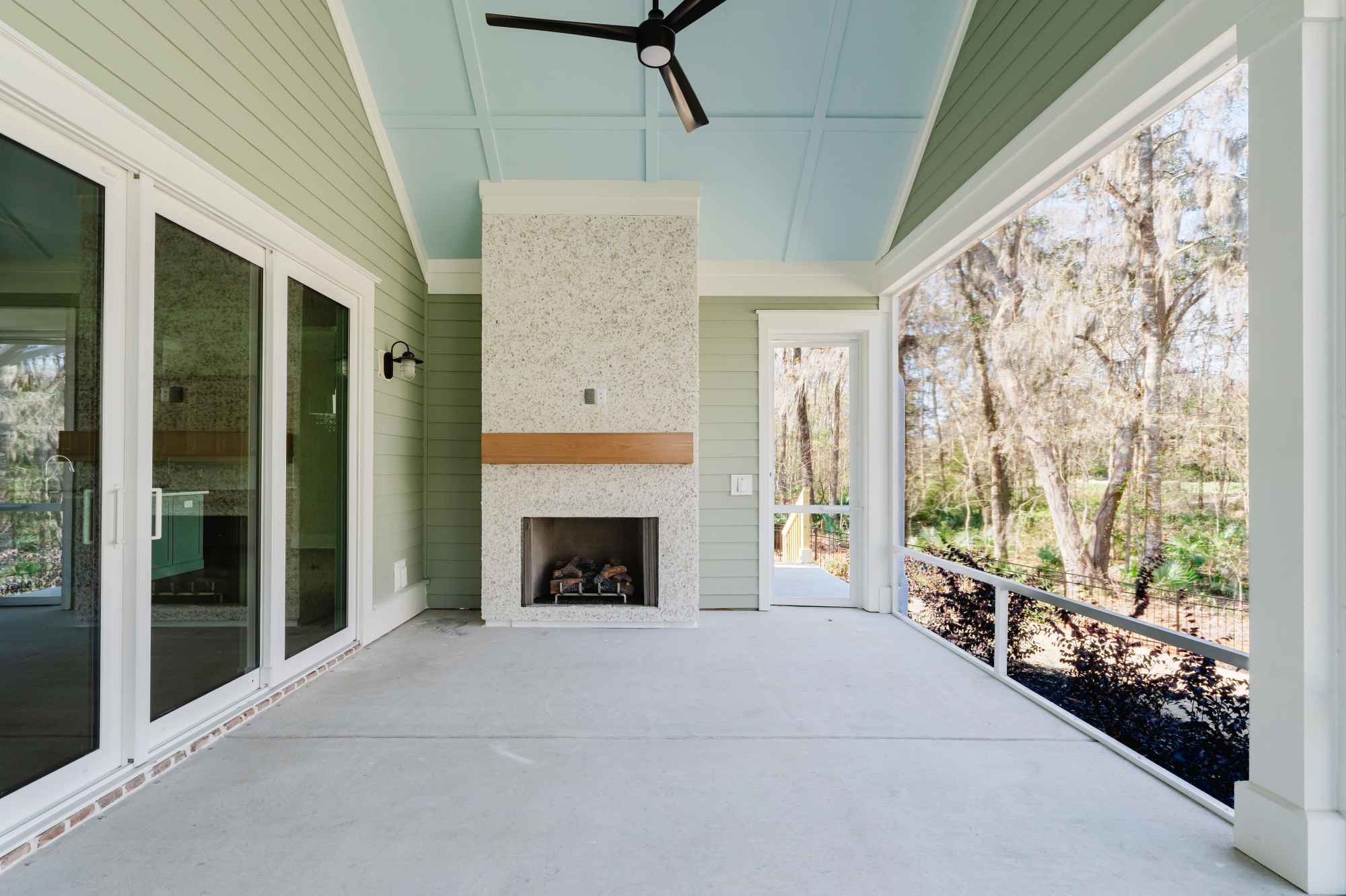 Screened in porch with tabby fireplace and vaulted ceilings