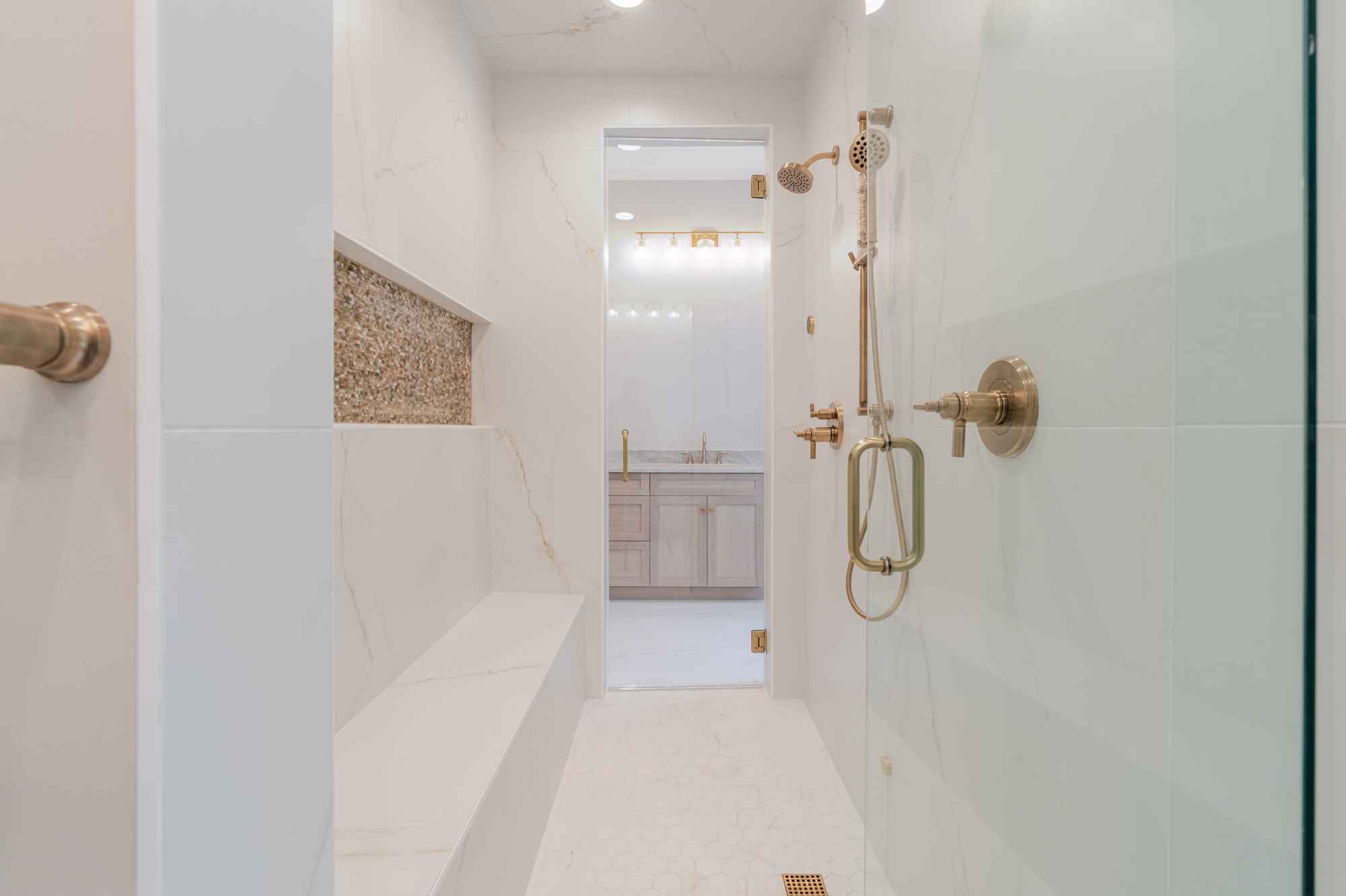 luxurious owners bath with big pass-thru shower and his/hers separate vanity