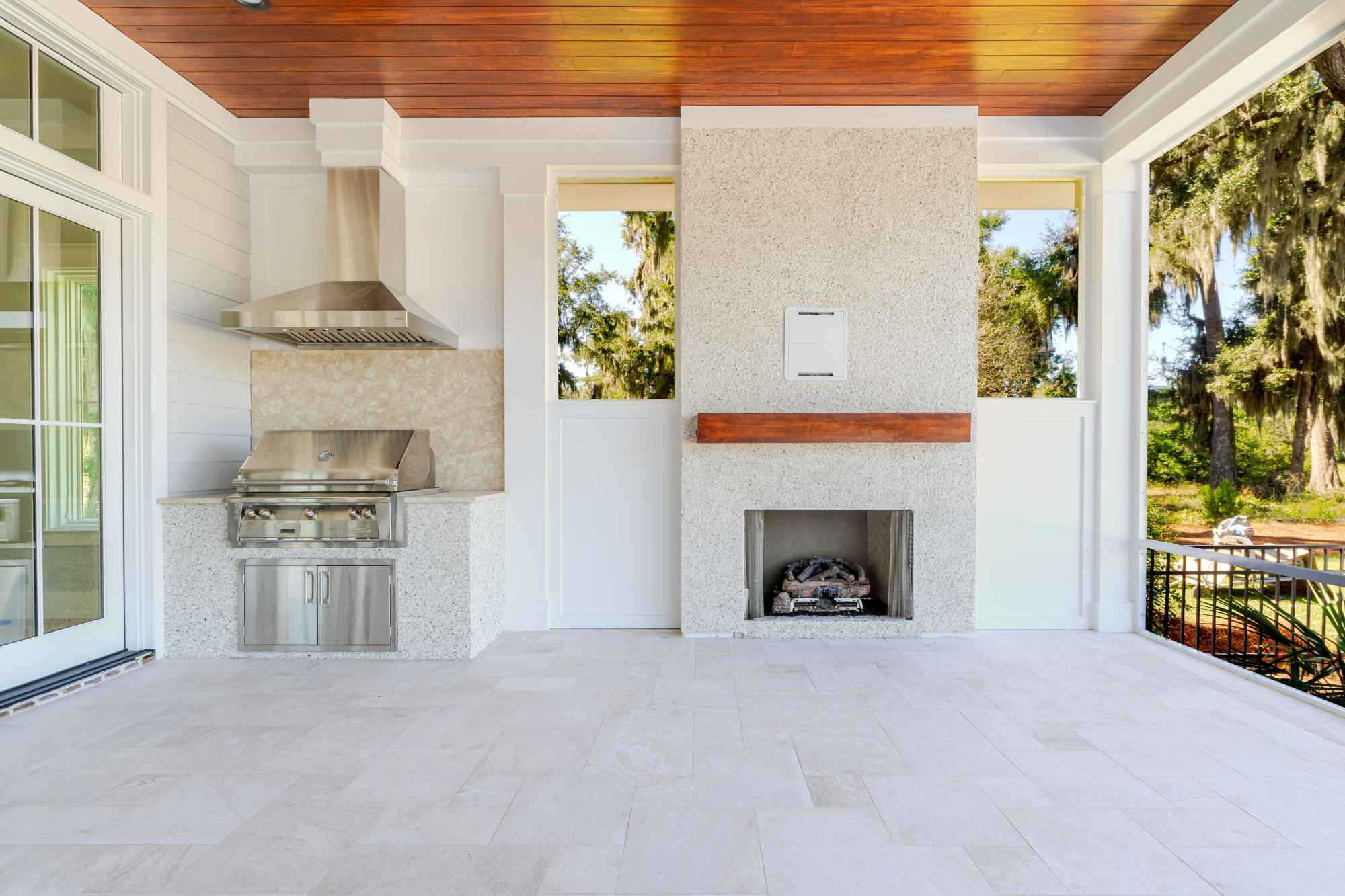 stone screened porch with fireplace and outdoor kitchen