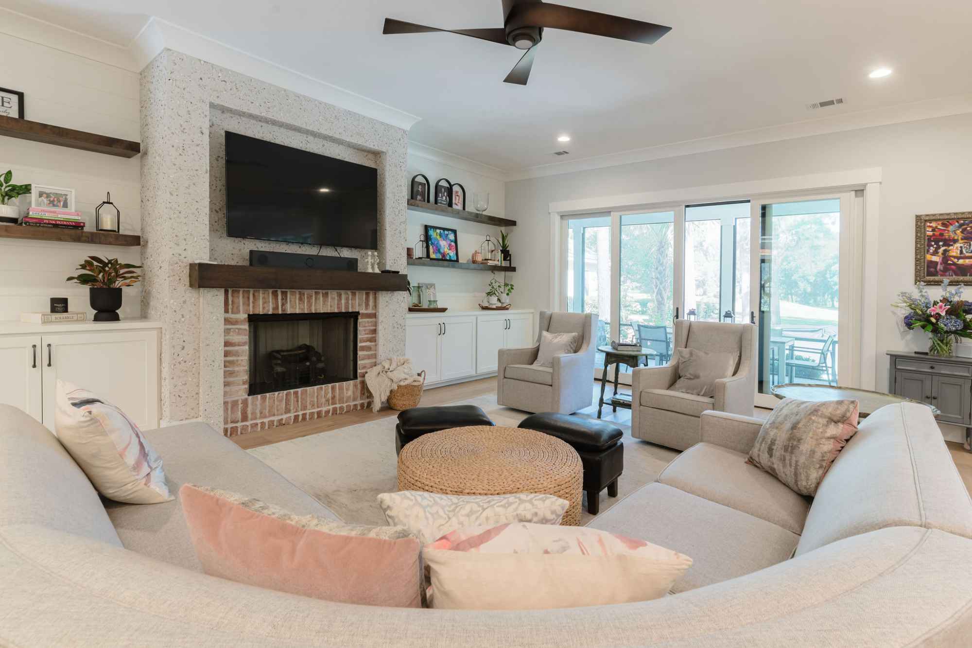 oversized screen porch with fireplace and outdoor kitchen